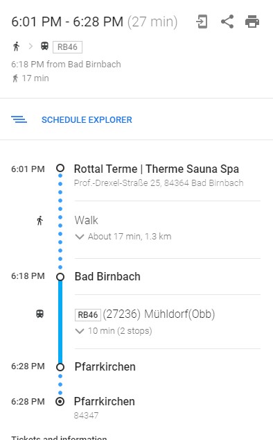 To go from Pfarrkirchen to Eggenfelden, you can always take the Regional train at the Pfarrkirchen train station. Trains to Eggenfelden leave every hour, always at half past. It takes 15 min by train, and tickets cost